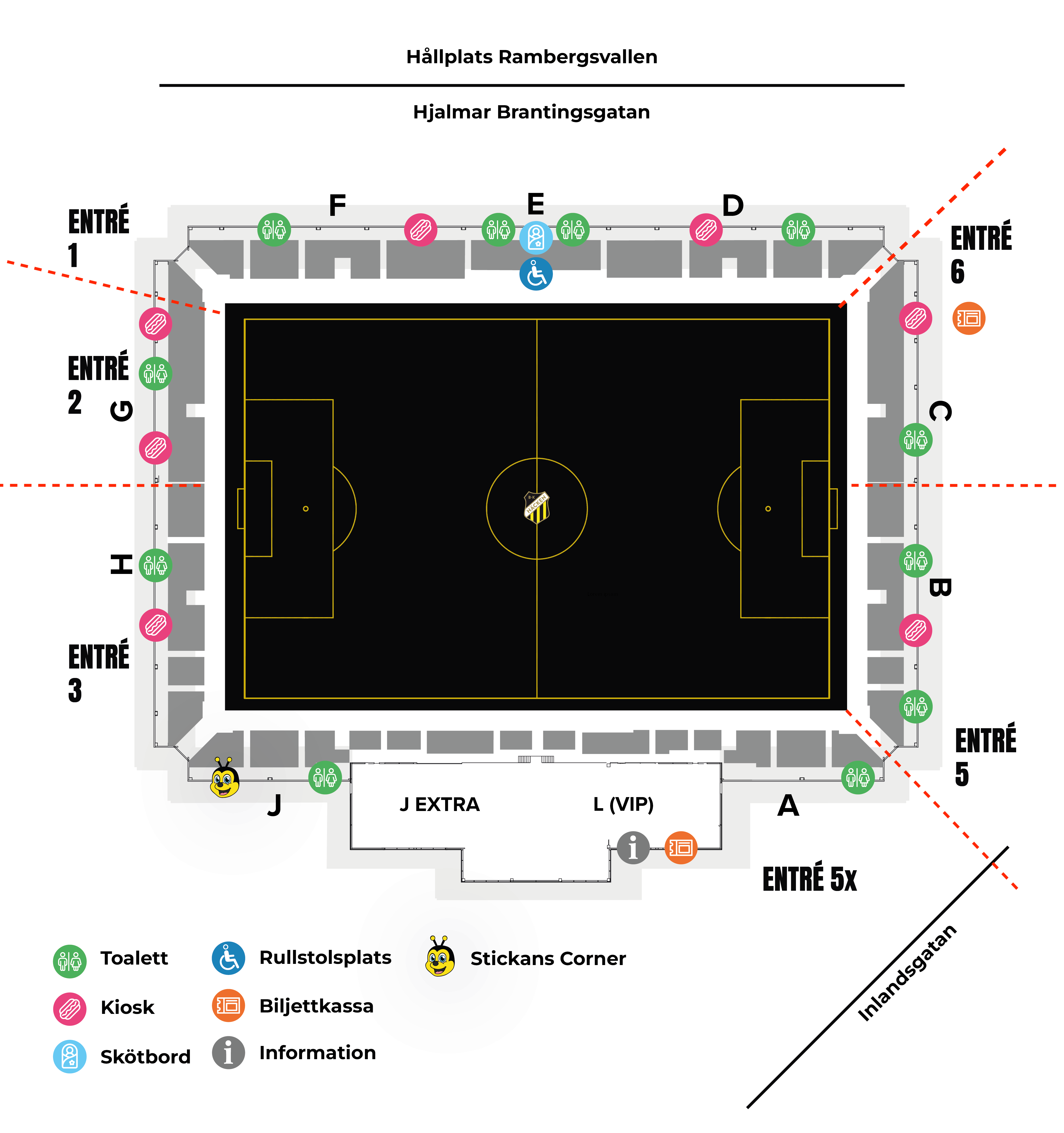 * Denna match är det avgränsat mellan sektioner som inte delar entré. Det går alltså inte att röra sig mellan exempelvis långsida och hemmaklack.
